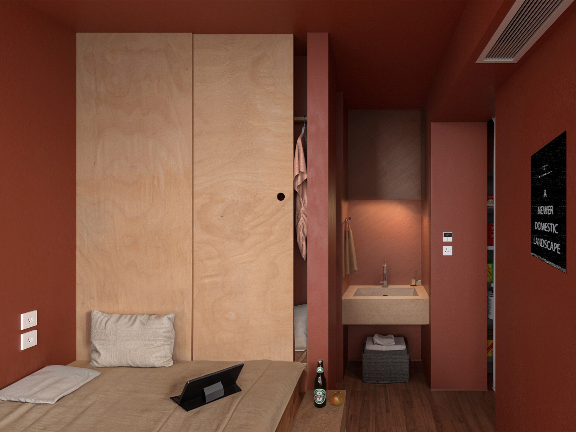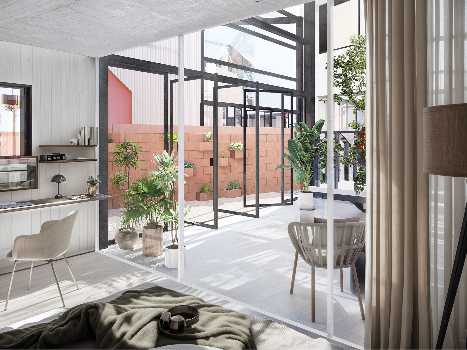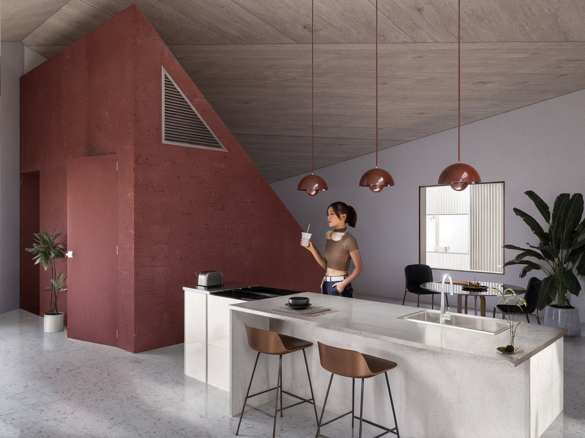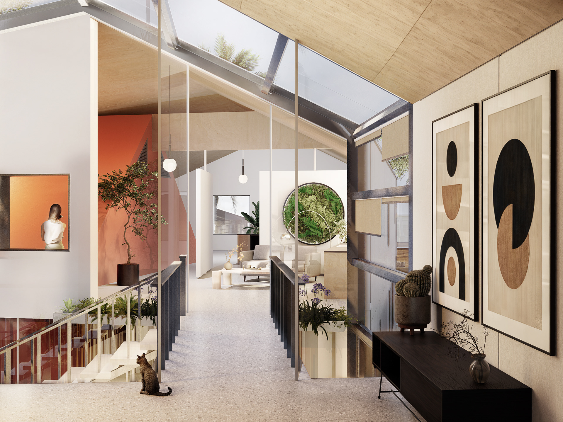 The proposed project responds through densification and innovation. It introduces a prototype for a three-unit apartment on a typical single-family lot in Altadena, California, preserving land for a natural buffer zone. Each unit places private spaces like bedrooms on the ground floor and public living areas above. Rotatable walls between units allow residents to connect or separate spaces, fostering flexible co-living that balances privacy and community. This also allows the units to be combined in the future to accommodate changes in household structures. A double-height greenhouse anchors the project, offering a climate-controlled shared space that supports sustainability and social interaction.