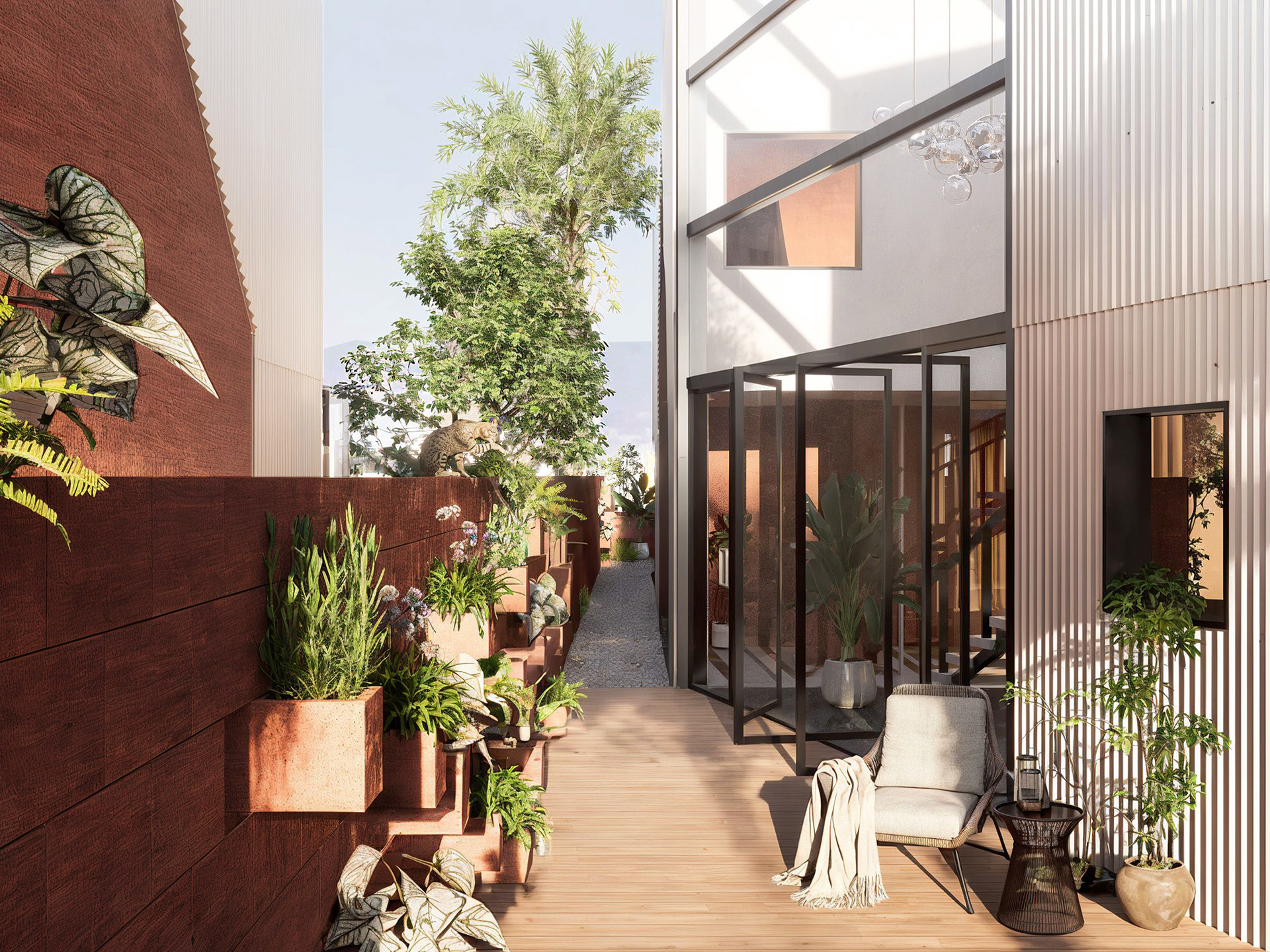Resilience is central to the design. Each unit centers around a prefabricated reinforced concrete core that serves as a shelter for people, pets, and valuables during wildfire and earthquake events. This core is multifunctional: it supports circulation between the two levels, condenses bathroom services, and integrates a specialized HVAC system that shuts down external air intake during fires while purifying air inside, preventing internal ignition—a leading cause of home loss. Drawing from passive design strategies, the project emphasizes airtightness, fire resistance, and climate resiliency.